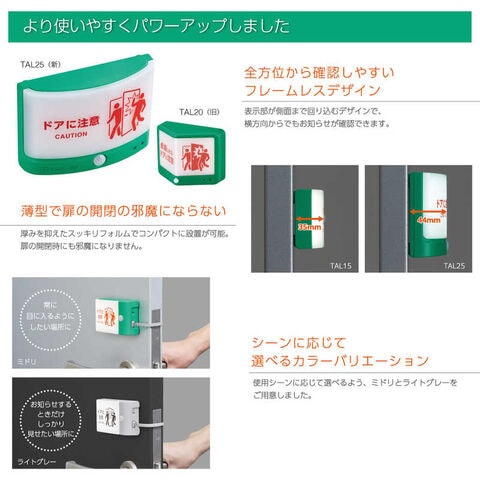 累計販売数85000個を超えた、「扉につけるお知らせライト(TAL10/TAL20)」がリニューアル!全方位から「お知らせ」を確認しやすいフレームレスデザインに変更しました。