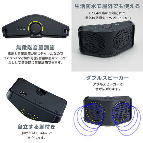 本体(スピーカー)はIPX4相当の生活防水のため、少量の雨が降っていても屋外の交通誘導やイベント案内、ツアーガイド、店頭販売・PRなどで安心してご使用いただけます。