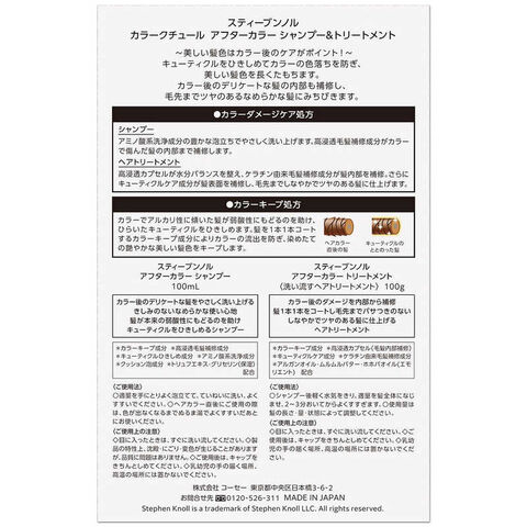 スティーブンノル カラークチュール アフターカラー シャンプー&トリートメント(br)(br)美しい髪色はカラー後のケアがポイント。キューティクルをひきしめてカラーの色落ちを防ぎ、美しい髪色を長くたもちます。(br)カラー後のデリケートな髪の内部も補修し、毛先までツヤのあるなめらかな髪にみちびきます。(br)(br)カラーダメージケア処方(br)シャンプー:アミノ酸系洗浄成分の豊かな泡立ちでやさしく洗い上げます。高浸透毛髪補修成分がカラーで傷んだ髪の内部まで補修します。(br)ヘアトリートメント:高浸透カプセルが水分バランスを整え、ケラチン由来毛髪補修成分が髪内部を補修。さらにキューティクルケア成分が髪表面を補修し、毛先までしなやかでツヤのある髪に仕上げます。(br)(br)カラーキープ処方(br)カラーでアルカリ性に傾いた髪が弱酸性にもどるのを助け、ひらいたキューティクルをひきしめます。髪を1本1本コートするカラーキープ成分によりカラーの流出を防ぎ、染めたての艶やかな美しい髪色をキープします。(br)(br)●スティーブンノル アフターカラー シャンプー 100mL : カラー後のデリケートな髪をやさしく洗い上げるきしみのないなめらかな使い心地。髪が本来の弱酸性にもどるのを助けキューティクルをひきしめるシャンプー。カラーキープ成分、高浸透毛髪補修成分、キューティクルひきしめ成分、アミノ酸系洗浄成分、クッション泡成分、トリュフエキス・グリセリン (保湿) 配合。カラーキープ成分はポリクオタニウム-104、高浸透毛髪補修成分はオリーブ脂肪酸エチル、キューティクルひきしめ成分はクエン酸、アミノ酸系洗浄成分はココイルグルタミン酸TEA、クッション泡成分はポリクオタニウム-7、ココイルメチルタウリンNa、トリュフエキスはツベルアエスチブムエキスです。(br)(br)●スティーブンノル アフターカラー トリートメント (洗い流すヘアトリートメント) 100g : カラー後のダメージを内部から補修。髪 1本1本をコートし毛先までパサつきのないしなやかでツヤのある髪に仕上げるヘアトリートメント。カラーキープ成分、高浸透カプセル (毛髪内部補修) 、キューティクルケア成分、ケラチン由来毛髪補修成分、アルガンオイル・ムルムルバター・ホホバオイル (エモリエント) 配合。カラーキープ成分はポリクオタニウム-104、高浸透カプセルはトリュフエキス (ツベルアエスチブムエキス) ・アミノ酸 (グリシン) ・ジココイルエチルヒドロキシエチルモニウムメトサルフェート・コレステロール・セラミドNG、キューティクルケア成分はジグルコシル没食子酸、ケラチン由来毛髪補修成分は加水分解ケラチン、アルガンオイルはアルガニアスピノサ核油、ムルムルバターはアストロカリウムムルムル種子脂、ホホバオイルはホホバ種子油です。