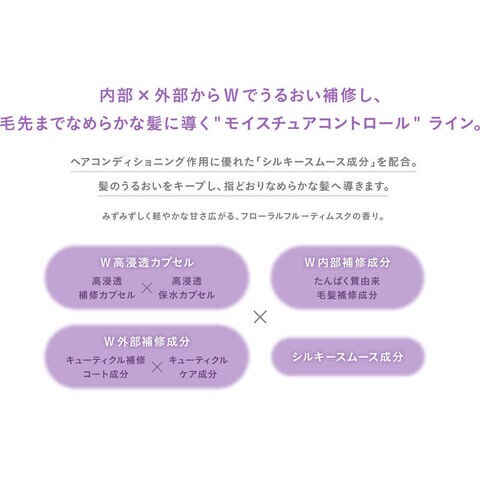 乾燥やパサつきが気になる髪を、内部×外部からWでうるおい補修し、毛先までなめらかな髪に導く“モイスチュアコントロール”コンディショナー。(br)(br)ヘアコンディショニング作用に優れた「シルキースムース成分」を配合。(br)髪のうるおいをキープし、指通りなめらかな髪へ導きます。(br)みずみずしく軽やかな甘さ広がる、フローラルフルーティムスクの香り。(br)(br)・なめらかな使用感で髪全体にゆきわたり、ドライ後もうるおいのあるなめらかな髪を持続させるコンディショナー。(br)(br)・「W 高浸透カプセル」配合。2 種の多重層カプセルが髪内部まで浸透し、深層ダメージを補修。 毛先までうるおいで満たします。(br)(br)・「W 外部補修成分」配合。キューティクルを補修し、ツヤやかな髪に導きます。(br)(br)高浸透補修カプセル (毛髪補修) 、高浸透保水カプセル、たんぱく質由来毛髪補修成分、キューティクルケア成分 (毛髪補修) 、キューティクル補修コート成分、シルキースムース成分配合。高浸透補修カプセルはアミノ酸 (グリシン) ・セラミドNG・セラミドNP・コレステロール・ジココイルエチルヒドロキシエチルモニウムメトサルフェート、高浸透保水カプセルはダイズステロール・パルミチン酸・ジココイルエチルヒドロキシエチルモニウムメトサルフェート、たんぱく質由来毛髪補修成分はイソステアロイル加水分解コラーゲンAMPD、キューティクルケア成分はジグルコシル没食子酸、キューティクルケア補修コート成分はシロキクラゲエキス、シルキースムース成分はポリクオタニウム-51です。