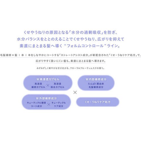 くせやうねりの原因となる「水分の過剰吸収」を防ぎ、水分バランスをととのえることでくせやうねり、広がりを抑えて素直にまとまる髪へ導く“フォルムコントロール”コンディショナー。