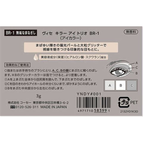ヴィセ キラー アイ トリオ BR-1 (アイカラー) 3g : 大粒偏光パール×高密着。グリッターアイカラー。BR-1 無垢なまなざし。無香料。まばゆい輝きの偏光パールと大粒グリッターで、視線を魅きつける印象的な目もとに。美容液成分 (保湿) (ヒアルロン酸・スクワラン) 配合。