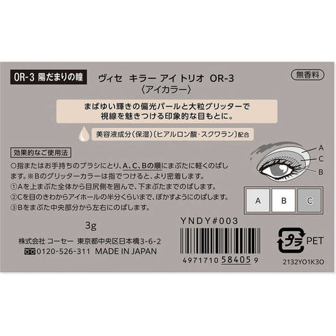 ヴィセ キラー アイ トリオ OR-3 (アイカラー) 3g : 大粒偏光パール×高密着。グリッターアイカラー。OR-3 陽だまりの瞳。無香料。まばゆい輝きの偏光パールと大粒グリッターで、視線を魅きつける印象的な目もとに。美容液成分 (保湿) (ヒアルロン酸・スクワラン) 配合。