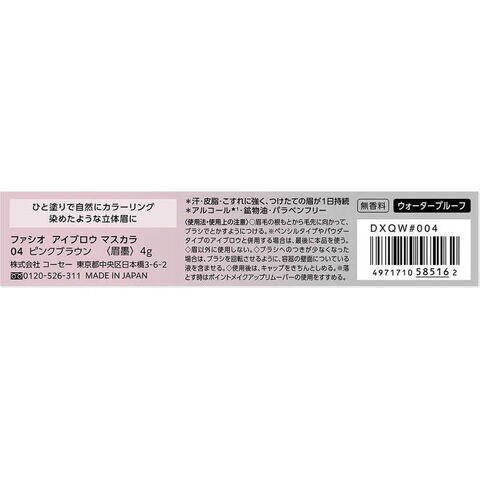 ファシオ アイブロウ マスカラ 04 ピンクブラウン (眉墨) 4g : ひと塗りで自然にカラーリング。染めたような立体眉に。汗・皮脂・こすれに強く、つけたての眉が1日持続。アルコール (エチルアルコール) ・鉱物油・パラベンフリー。無香料。ウォータープルーフ。