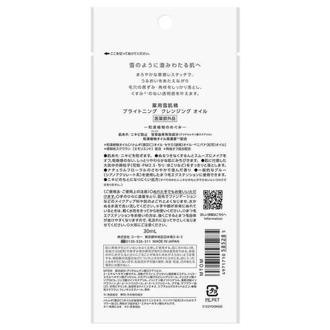 薬用雪肌精 ブライトニング クレンジング オイル (医薬部外品) 30mL : おためし10日分。甘草由来有効成分配合。美容オイル発想で落とすたびうるおう。酸化皮脂まで取りのぞき透明感ケア。雪のように澄みわたる肌へ。まろやかな摩擦レスタッチで、うるおいをあたえながら毛穴の黒ずみ・角栓をしっかり落とし、くすみ (乾燥による) のない透明感を叶えます。肌あれ・ニキビ防止 : 甘草由来有効成分 (グリチルレチン酸ステアリル) 。和漢植物オイル高濃度 (従来品比) 配合。和漢植物オイル (ハトムギ (?苡仁) オイル・セサミ (胡麻) オイル・ベニバナ (紅花) オイル) 。植物性スクワラン (エモリエント) 配合。角栓オフ成分配合。肌あれ・ニキビを防ぎます。ぬるつきなくするんとスムーズにメイクをオフ。乾燥感のない、しっとりやわらかな肌にみちびきます。肌に付着した大気中の微粒子 (花粉・PM2.5・ちり・ほこりなど) をすっきりと落とします。ナチュラルフローラルのさわやかで澄んだ香り。一般的なグルー (シアノアクリレート系) を使用したまつ毛エクステンションに使用できます。ニキビのもとになりにくい処方 (すべてのかたにニキビのもとができないというわけではありません。) 。