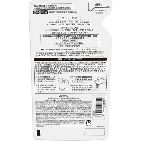 スティーブンノル ハイドロリニューミスト カラープロテクト A (詰め替え用) (洗い流さないヘアトリートメント) 230mL : 美容液のように濃密なうるおいが、髪の深部まで浸透・補修。つややかできれいな髪色が続く。酸熱ケア成分 (ヘアアイロン・ドライヤーの熱を活かしてなめらかな髪に仕上げます) 。ヒートアクティベイティング処方。カラーラスティング処方。ドライヤーなどの熱から髪をまもりながら、しっかり補修します。W高浸透カプセル (毛髪補修) 、熱プロテクト処方、チアシードオイル (ツヤ) 、キューティクルリペア成分 (毛髪補修) 、カラーキープ成分配合。