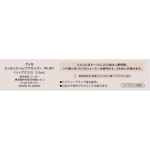 ヴィセ エッセンス リッププランパー SP003 (リップグロス) 5.5mL : PK801 モーヴピンク。美容液成分 in。唇ぽってりリッププランパー。バニラミントの香り。じんじん&すーっとした心地よい使用感。ツヤ高くぽってりボリューミーな唇を叶え、うるおいが続きます。美容液成分 (保湿) (ヒアルロン酸・スクワラン) 配合。スパイシープランプ成分配合。口紅の下地やグロスとしても使えます。