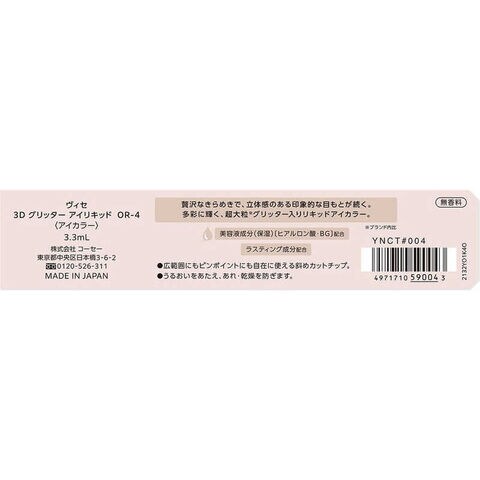 ヴィセ 3D グリッター アイリキッド OR-4 (アイカラー) 3.3mL : 輝きで立体的にみせる超大粒 (ブランド内比) グリッター×高密着リキッドアイカラー。OR-4 オレンジジェミイ。贅沢なきらめきで、立体感のある印象的な目もとが続く。多彩に輝く、超大粒 (ブランド内比) グリッター入りリキッドアイカラー。美容液成分 (保湿) (ヒアルロン酸・BG) 配合。ラスティング成分配合。広範囲にもピンポイントにも自在に使える斜めカットチップ。うるおいをあたえ、あれ・乾燥を防ぎます。無香料。