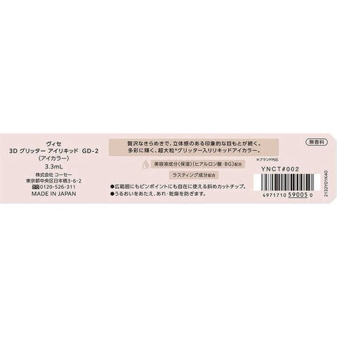ヴィセ 3D グリッター アイリキッド GD-2 (アイカラー) 3.3mL : 輝きで立体的にみせる超大粒 (ブランド内比) グリッター×高密着リキッドアイカラー。GD-2 ゴールドジェミイ。贅沢なきらめきで、立体感のある印象的な目もとが続く。多彩に輝く、超大粒 (ブランド内比) グリッター入りリキッドアイカラー。美容液成分 (保湿) (ヒアルロン酸・BG) 配合。ラスティング成分配合。広範囲にもピンポイントにも自在に使える斜めカットチップ。うるおいをあたえ、あれ・乾燥を防ぎます。無香料。