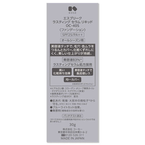 エスプリーク ラスティング セラム リキッド OC-405 (ファンデーション) 30g : オークル405。SPF25/PA++。オールシーズン用。1日中くずれない美容液仕立てのつるん肌リキッドファンデーション。美容液タッチで、毛穴・色ムラをつるんとカバー。化粧くずれしにくく、美しい仕上がりが持続。美容液83% (粉体をのぞくエマルジョン) 。高い化粧もち効果。美容液タッチで負担感レス。均一カバー。ヒアルロン酸・コラーゲン・オリーブ果実オイル・ドクダミエキス・スクワラン (保湿) 、酸素透過ポリマー (化粧もち) 、ラスティング成分EX配合。肌あれ・乾燥・大気中の微粒子 (ちり・ほこり・花粉・PM2.5など) から守る。ブルーライトカット効果。無香料 (植物成分の自然な香り) 。パッチテスト済み : すべてのかたに皮膚刺激が起きないというわけではありません。
