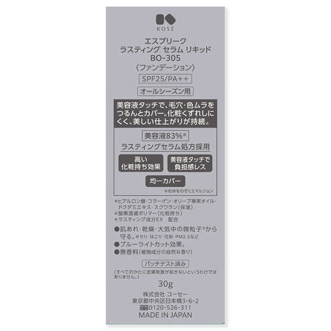 エスプリーク ラスティング セラム リキッド BO-305 (ファンデーション) 30g : ベージュオークル305。SPF25/PA++。オールシーズン用。1日中くずれない美容液仕立てのつるん肌リキッドファンデーション。美容液タッチで、毛穴・色ムラをつるんとカバー。化粧くずれしにくく、美しい仕上がりが持続。美容液83% (粉体をのぞくエマルジョン) 。高い化粧もち効果。美容液タッチで負担感レス。均一カバー。ヒアルロン酸・コラーゲン・オリーブ果実オイル・ドクダミエキス・スクワラン (保湿) 、酸素透過ポリマー (化粧もち) 、ラスティング成分EX配合。肌あれ・乾燥・大気中の微粒子 (ちり・ほこり・花粉・PM2.5など) から守る。ブルーライトカット効果。無香料 (植物成分の自然な香り) 。パッチテスト済み : すべてのかたに皮膚刺激が起きないというわけではありません。