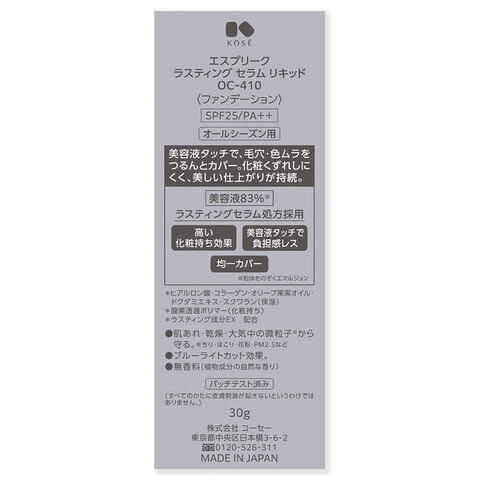 エスプリーク ラスティング セラム リキッド OC-410 (ファンデーション) 30g : オークル410。SPF25/PA++。オールシーズン用。1日中くずれない美容液仕立てのつるん肌リキッドファンデーション。美容液タッチで、毛穴・色ムラをつるんとカバー。化粧くずれしにくく、美しい仕上がりが持続。美容液83% (粉体をのぞくエマルジョン) 。高い化粧もち効果。美容液タッチで負担感レス。均一カバー。ヒアルロン酸・コラーゲン・オリーブ果実オイル・ドクダミエキス・スクワラン (保湿) 、酸素透過ポリマー (化粧もち) 、ラスティング成分EX配合。肌あれ・乾燥・大気中の微粒子 (ちり・ほこり・花粉・PM2.5など) から守る。ブルーライトカット効果。無香料 (植物成分の自然な香り) 。パッチテスト済み : すべてのかたに皮膚刺激が起きないというわけではありません。