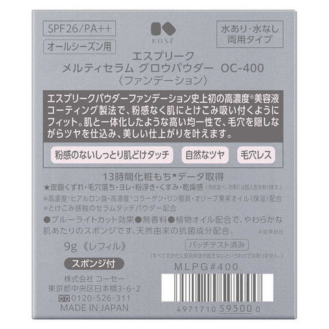 エスプリーク メルティセラム グロウパウダー (レフィル) OC-400 (ファンデーション) 9g : スポンジ付。SPF26/PA++。オールシーズン用。水あり・水なし両用タイプ。オークル 400。高濃度 (従来品比) 美容液コーティング製法。ツヤどけパウダー。エスプリークパウダーファンデーション史上初の高濃度 (従来品比) 美容液コーティング製法で、粉感なく肌にとけこみ吸い付くようにフィット。肌と一体化したような高い均一性で、毛穴を隠しながらツヤを仕込み、美しい仕上がりを叶えます。粉感のないしっとり肌どけタッチ。自然なツヤ。毛穴レス。13時間化粧もち (皮脂くずれ・毛穴落ち・ヨレ・粉浮き・くすみ・乾燥感 (当社調べ。効果には個人差があります。) ) データ取得。高濃度 (従来品比) ヒアルロン酸・高濃度 (従来品比) コラーゲン・リン脂質・オリーブ果実オイル (保湿) 配合。とけこみ感触のセラムタッチパウダー配合。ブルーライトカット効果。無香料。植物オイル配合で、やわらかな肌あたりのスポンジです。天然由来の抗菌成分配合。パッチテスト済み (すべてのかたに皮膚刺激が起きないというわけではありません。) 。
