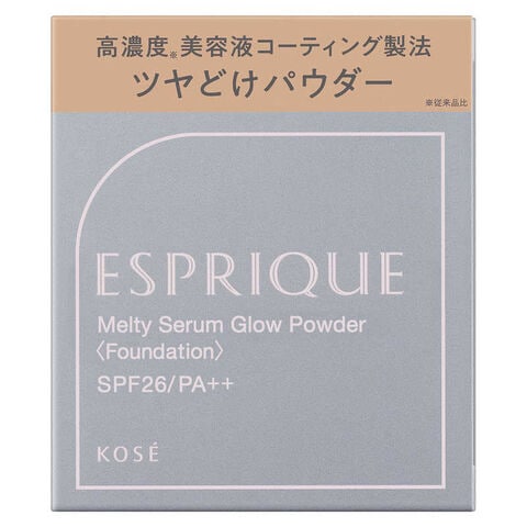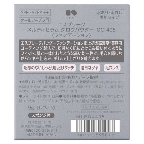 エスプリーク メルティセラム グロウパウダー (レフィル) OC-405 (ファンデーション) 9g : スポンジ付。SPF26/PA++。オールシーズン用。水あり・水なし両用タイプ。オークル 405。高濃度 (従来品比) 美容液コーティング製法。ツヤどけパウダー。エスプリークパウダーファンデーション史上初の高濃度 (従来品比) 美容液コーティング製法で、粉感なく肌にとけこみ吸い付くようにフィット。肌と一体化したような高い均一性で、毛穴を隠しながらツヤを仕込み、美しい仕上がりを叶えます。粉感のないしっとり肌どけタッチ。自然なツヤ。毛穴レス。13時間化粧もち (皮脂くずれ・毛穴落ち・ヨレ・粉浮き・くすみ・乾燥感 (当社調べ。効果には個人差があります。) ) データ取得。高濃度 (従来品比) ヒアルロン酸・高濃度 (従来品比) コラーゲン・リン脂質・オリーブ果実オイル (保湿) 配合。とけこみ感触のセラムタッチパウダー配合。ブルーライトカット効果。無香料。植物オイル配合で、やわらかな肌あたりのスポンジです。天然由来の抗菌成分配合。パッチテスト済み (すべてのかたに皮膚刺激が起きないというわけではありません。) 。