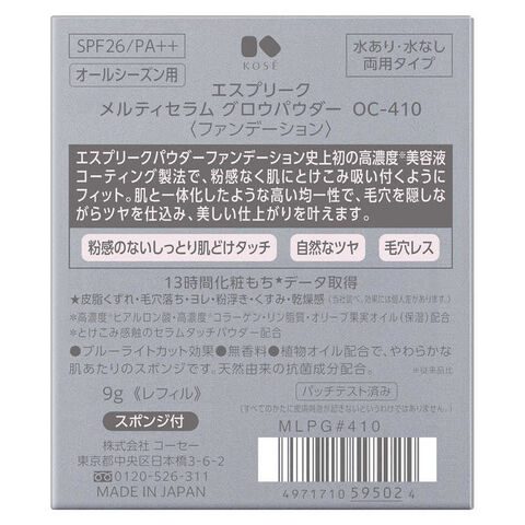 エスプリーク メルティセラム グロウパウダー (レフィル) OC-410 (ファンデーション) 9g : スポンジ付。SPF26/PA++。オールシーズン用。水あり・水なし両用タイプ。オークル 410。高濃度 (従来品比) 美容液コーティング製法。ツヤどけパウダー。エスプリークパウダーファンデーション史上初の高濃度 (従来品比) 美容液コーティング製法で、粉感なく肌にとけこみ吸い付くようにフィット。肌と一体化したような高い均一性で、毛穴を隠しながらツヤを仕込み、美しい仕上がりを叶えます。粉感のないしっとり肌どけタッチ。自然なツヤ。毛穴レス。13時間化粧もち (皮脂くずれ・毛穴落ち・ヨレ・粉浮き・くすみ・乾燥感 (当社調べ。効果には個人差があります。) ) データ取得。高濃度 (従来品比) ヒアルロン酸・高濃度 (従来品比) コラーゲン・リン脂質・オリーブ果実オイル (保湿) 配合。とけこみ感触のセラムタッチパウダー配合。ブルーライトカット効果。無香料。植物オイル配合で、やわらかな肌あたりのスポンジです。天然由来の抗菌成分配合。パッチテスト済み (すべてのかたに皮膚刺激が起きないというわけではありません。) 。