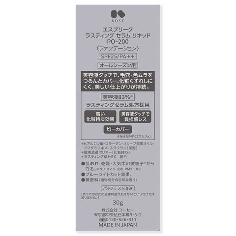 エスプリーク ラスティング セラム リキッド PO-200 (ファンデーション) 30g : ピンクオークル200。SPF25/PA++。オールシーズン用。1日中くずれない美容液仕立てのつるん肌リキッドファンデーション。美容液タッチで、毛穴・色ムラをつるんとカバー。化粧くずれしにくく、美しい仕上がりが持続。美容液83% (粉体をのぞくエマルジョン) 。高い化粧もち効果。美容液タッチで負担感レス。均一カバー。ヒアルロン酸・コラーゲン・オリーブ果実オイル・ドクダミエキス・スクワラン (保湿) 、酸素透過ポリマー (化粧もち) 、ラスティング成分EX配合。肌あれ・乾燥・大気中の微粒子 (ちり・ほこり・花粉・PM2.5など) から守る。ブルーライトカット効果。無香料 (植物成分の自然な香り) 。パッチテスト済み : すべてのかたに皮膚刺激が起きないというわけではありません。