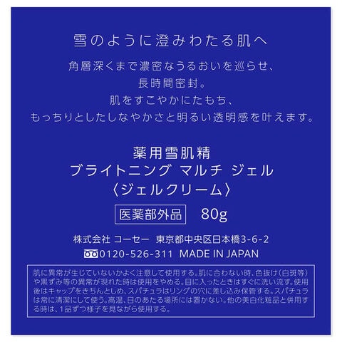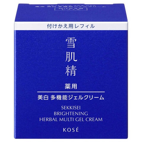薬用雪肌精 ブライトニング マルチ ジェル (ジェルクリーム) (医薬部外品) (付けかえ用) 80g : 付けかえ用レフィル。薬用美白多機能ジェルクリーム。雪のように澄みわたる肌へ。角層深くまで濃密なうるおいを巡らせ、長時間密封。肌をすこやかにたもち、もっちりをしたしなやかさと明るい透明感を叶えます。美白・肌あれ防止 甘草由来有効成分 (W-グリチルレチン酸ステアリル) 、ハトムギエキス高濃度 (ブランド内比) 配合 (くすみ (乾燥による) ケア) 。ハトムギ (?苡仁) エキス、トウキ (当帰) エキス、メロスリア (白?) エキス、ハトムギ (?苡仁) 水、タイソウ (大棗) エキス、カワラヨモギ (茵陳蒿) エキス、グリセリン (保湿) 、抱水オイルラッピング成分 (エモリエント) 配合。メラニンの生成を抑え、シミ・ソバカスを防ぎます。肌あれを防ぎます。乳液・美容液・クリーム・アイクリーム・美容オイル・マッサージ・マスクの効果があります。みずみずしくなめらかで、とろけるようにすっとなじむ使い心地。長時間うるおいを抱え込み、もっちり弾力感のあるすこやかな肌にみちびきます。ナチュラルフローラルのさわやかで澄んだ香り。自然由来指数86% (ISO 16128準拠) 。本品にキャップは付いていません。中身の品質をたもつため、必ず、使い終わった薬用雪肌精 ブライトニング マルチ ジェルに付けかえてお使いください。