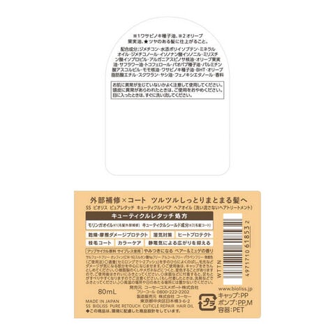 コーセーコスメポート SS BIOLISS(ビオリス) ピュアレタッチ キューティクルリペア ヘアオイル 80ml