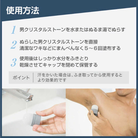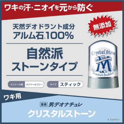 自然派ストーンタイプの制汗デオドラント。水でぬらすことで少しづつ溶け出し、肌に成分が付着します。天然デオドラント成分「アルム石」(※)配合で汗とニオイをしっかり抑え、朝ぬって夜まで続く。メントールなしでヒヤッとしない。無着色・無香料・防腐剤フリー・アルコールフリー。さらっとしたぬり心地でベタつきなし。