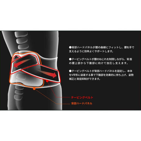 ●クロステーピング構造が、腰のねじれを制限しながら、背面の腰上部から下腹部に向けて、加圧し支えることで、腰椎から骨盤にかけてしっかりサポートします。