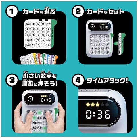 (1)早押しモード: カードを挿入してスタートボタンを押し、数字が小さいものから順にボタンを押す!早さを競うタイムアタック!