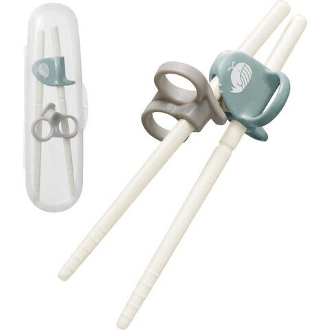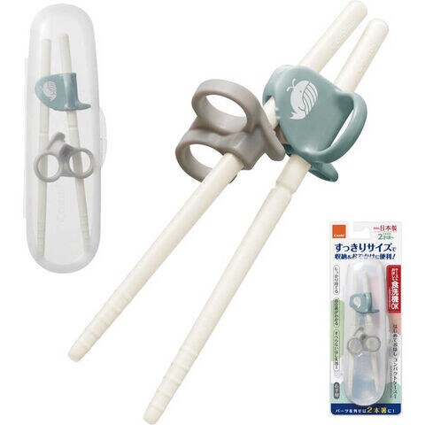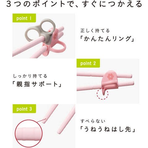 すぐにつかめて、やる気が育つ!プラスチックのおはしに、コンパクトケース付きが新登場!3つのポイントですぐに使え、3ステップで長く使える右手用おはしです。