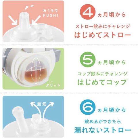 ●マグデビューに最適な”はじめてストロー”、コップ飲みのトレーニングができる”はじめてコップ”、漏れないことに拘った”漏れないストロー”の3つの飲み口を付け替えることで、成長に合わせて自分で飲めるをサポートします。