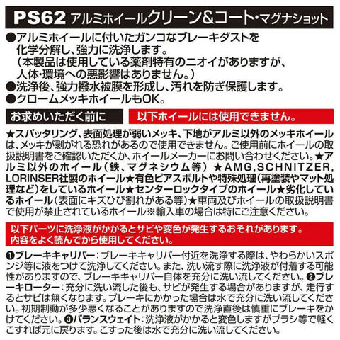 ・PS62 アルミホイールクリーン&コート・マグナショット: ブレーキダストを化学のチカラで強力除去!撥水コーティング効果でキレイが続くホイールクリーナー!←本製品