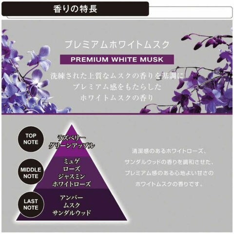 人気のホワイトムスクの香りを基調に清潔感のあるホワイトローズとサンダルウッドを調和させた、心地よい甘さが至高の時を演出するプレミアムなホワイトムスクの香りです。