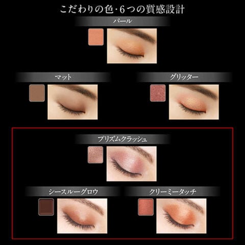 質感はパール、マット、グリッター、プリズムクラッシュ、シースルーグロウ、クリーミータッチの6つのタイプ。