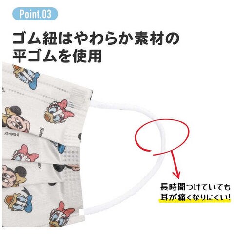 耳が痛くなりにくいやわらか素材の平ゴムを使用。