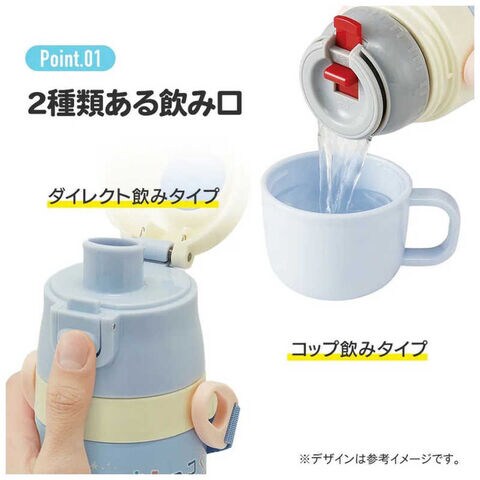 2種類ある飲み口を付け替えて、直接口を付けて飲めるダイレクト飲みタイプと、温かい飲み物もOKのコップ飲みタイプで使い分け!
