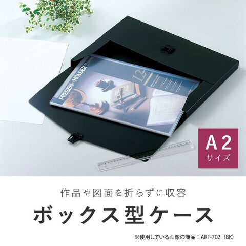 仕様1:規格:A2サイズ:縦460×横635×幅30mmカラー:ブラック取っ手材質:EVA樹脂本体材質:PP1.0mm厚収容用紙サイズ:A2用紙、B3レイアウト用紙