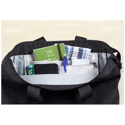 ●ショルダー紐フックを外し、背面ポケットの上から紐を入れて収納することで、 見た目もスッキリとしたトートバッグとして使用することができます。
