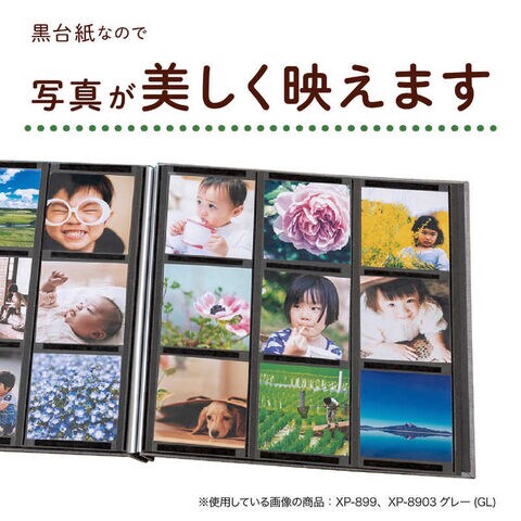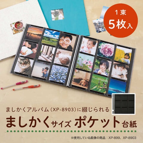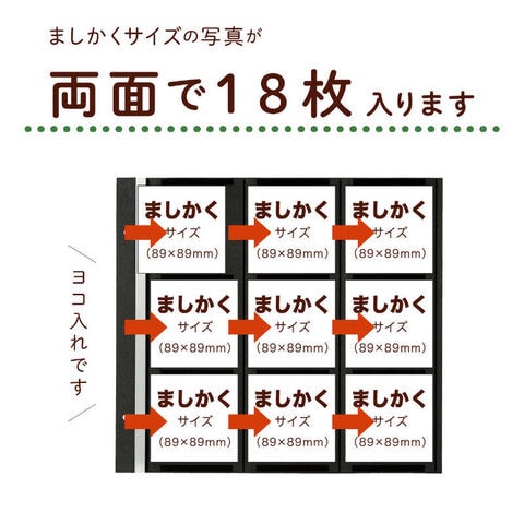 仕様1:[内容]黒台紙5枚、継ぎビス2本 [台紙サイズ]縦311×横340mm※表裏に9枚ずつ 、ましかくフォト(89×89mm)収容可能