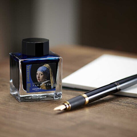 仕様1:・万年筆用水性染料インク・内容量:50ml・色名:フェルメールブルー・本体サイズ:W53×D44×H70mm・本体重量:203g・ボトル材質:ガラス・キャップ材質:PP・箱サイズ:W55×D47×H76mm・箱材質:紙
