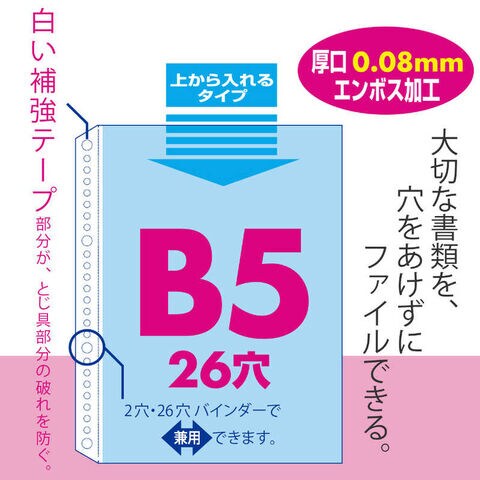 仕様1:規格:B5-S タテ入れ本体サイズ:縦263×横203mm 収容サイズ:縦259×横187mm 穴数:26穴(2穴・26穴対応) 材質:PP 80ミクロン(静電気防止加工) 1袋50枚入
