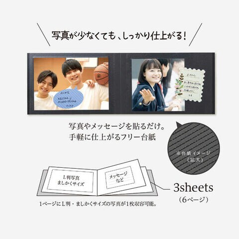写真が少なくても手軽に作りやすい、小さいサイズで少ないページ数。記念日のお祝いや少人数での送別用のギフトにも便利。1ページにL判、又はましかくサイズの写真が1枚貼れます。(フリー台紙3枚全6ページ)
