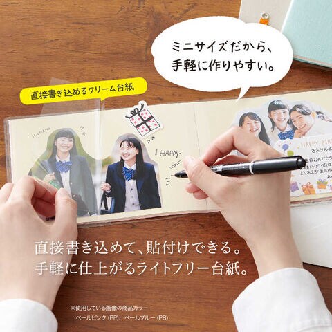 写真やメッセージを貼るだけで仕上がる、ミニサイズのフリー台紙アルバム。貼り直しができ、直接書き込めるクリーム台紙(ライトフリー台紙)。
