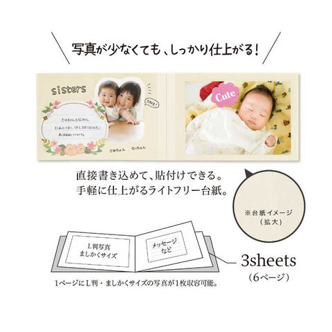写真が少なくても手軽に作りやすい、小さいサイズで少ないページ数。記念日のお祝いや少人数での送別用のギフトにも便利。1ページにL判、又はましかくサイズの写真が1枚貼れます。(フリー台紙3枚全6ページ)