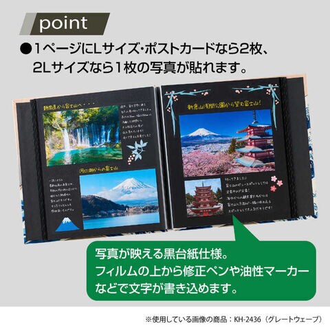 ・1ページにLサイズ、ポストカードサイズ2枚、2Lサイズなら1枚の写真が貼れます