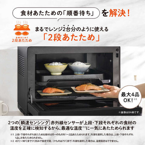 2つの瞬速センシング赤外線センサーが、上段と下段に置いた食材の温度を1秒ごとに正確に検知するので、それぞれに設定した温度にあたためることができ、便利です。