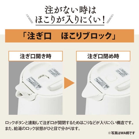 ・ロックボタンと連動して注ぎ口が開閉するため、ほこりなどが入りにくい構造です。