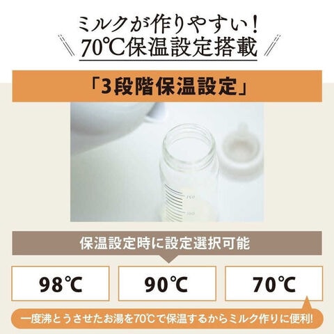 ・「70℃保温」は一度沸とうさせたお湯を70℃で保温する、ミルク作りに便利な機能です。