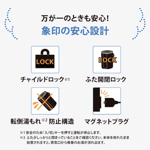 ● トリプル安心設計「チャイルドロック」「ふた開閉ロック」「転倒湯もれ防止構造」