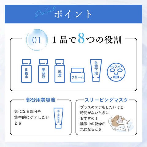 1品で「化粧水・美容液・乳液・クリーム・化粧下地」の基本の5役と、「部分用美容液・マスク・スリーピングマスク」のスペシャルケア3役、合わせて8役をかねそなえたオールインワンジェルです。