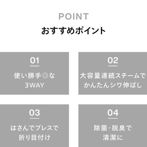 約20g/分のパワフルスチームでシャツやブラウスのシワやヨレを短時間で整えます。