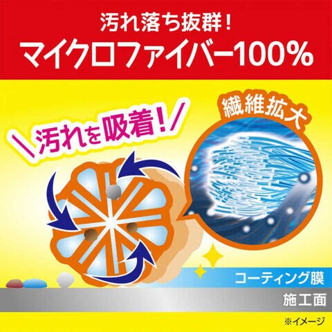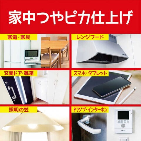 冷蔵庫や電子レンジ等の家電や、テーブル等の家具に付着したベタつきや手アカを超極細繊維でぐんぐん吸着してズバッと拭き取り、同時に表面にコーティング膜を形成。
