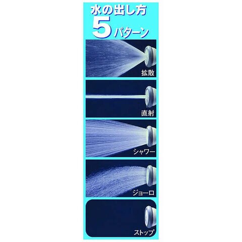 水の出し方が5パターン(拡散・直射・シャワー・ジョーロ・ストップ)変更でき、用途に合わせて使い分けられます。
