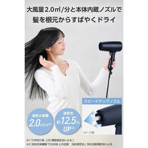 大風量の2.0m3/分(※1)と本体内蔵スピードアップノズルで、髪を根元から素早く乾かせます。速乾性約12.5%アップ(※2)で、忙しい毎日も時短でヘアドライができます。 ※1 TURBO使用時 JIS規格測定法による ※2 当社従来機種TD200Bとの比較 当社測定法/当社比較検証法による